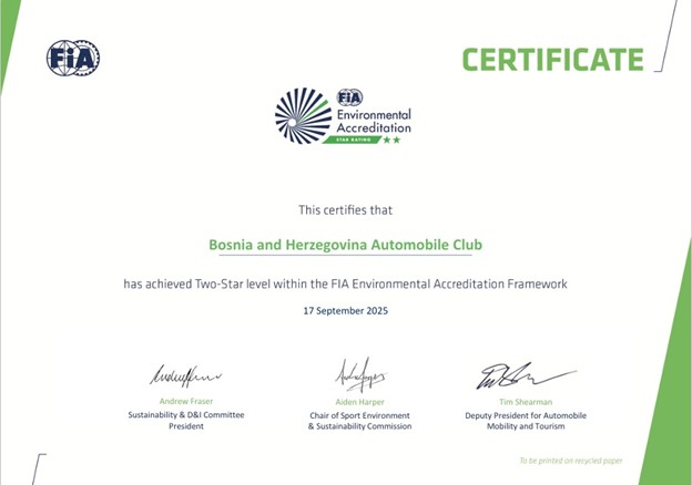 Septembar mjesec je u BIHAMK-u bio obilježen nizom važnih aktivnosti, od kojih je posebno vrijedno spomenuti da je, nakon što smo na nivou BIHAMK Grupacije proveli niz zahtjevnih procedura za produženje međunarodno priznatog FIA ekološkog standarda. FIA je obnovila BIHAMK-ovu ekološku akreditaciju s dvije zvjezdice, čime BIHAMK nastavlja svoju praksu društveno odgovornog poslovanja, te ostaje jedan od prvih auto-klubova u Evropi s dostignutim nivoom ekološkog certifikata od dvije od maksimalno tri zvjezdice i jača svoje prakse za primjenu najviših ekoloških standarda rada u budućem periodu.