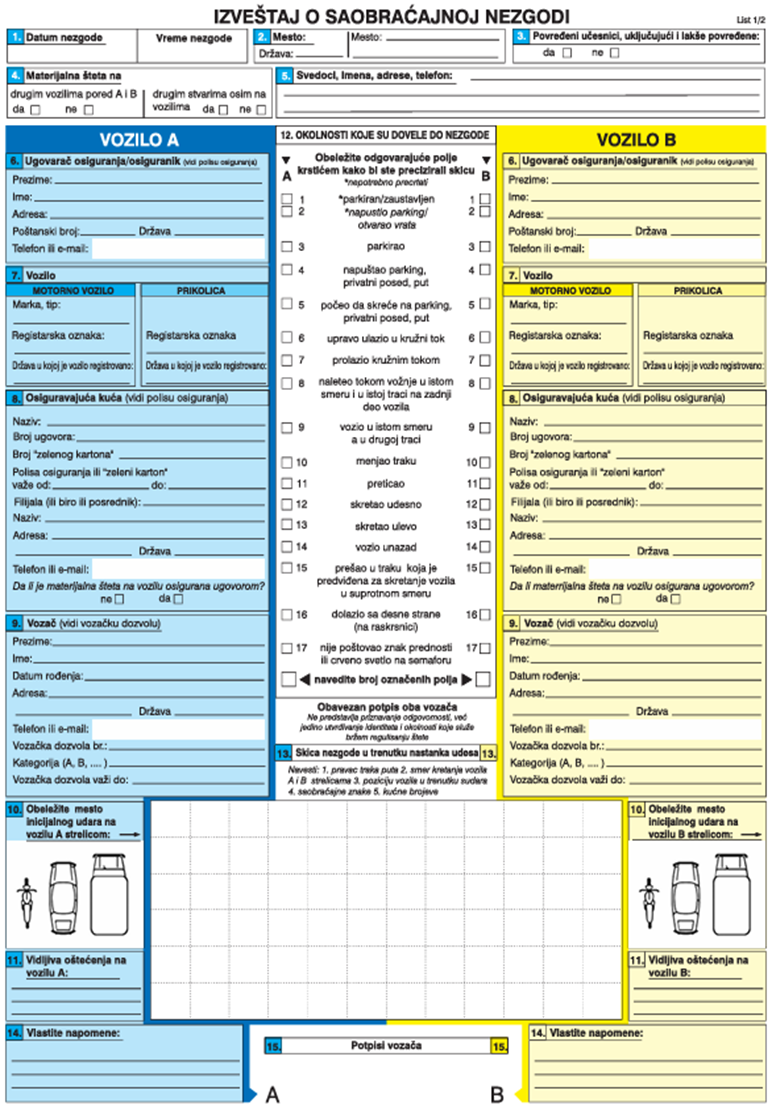 U nastavku je prikazan primjer evropskog izvještaja o saobraćajnoj nezgodi, a pri popunjavanju se upisuju sljedeći podaci: