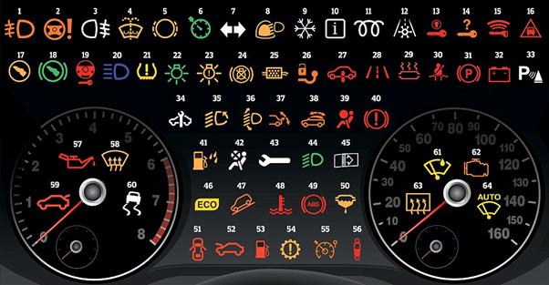 - Narandžasta ili žuta boja upozorava vozača da neki sustav u vozilu ne radi ispravno, nedostatak određene tekućine ili ispadanje sustava iz funkcije. Kod pojave ove lampice, preporučuje se zaustavljanje vozila i provjera stanja sustava, kako bi se izbjegla trajna oštećenja.